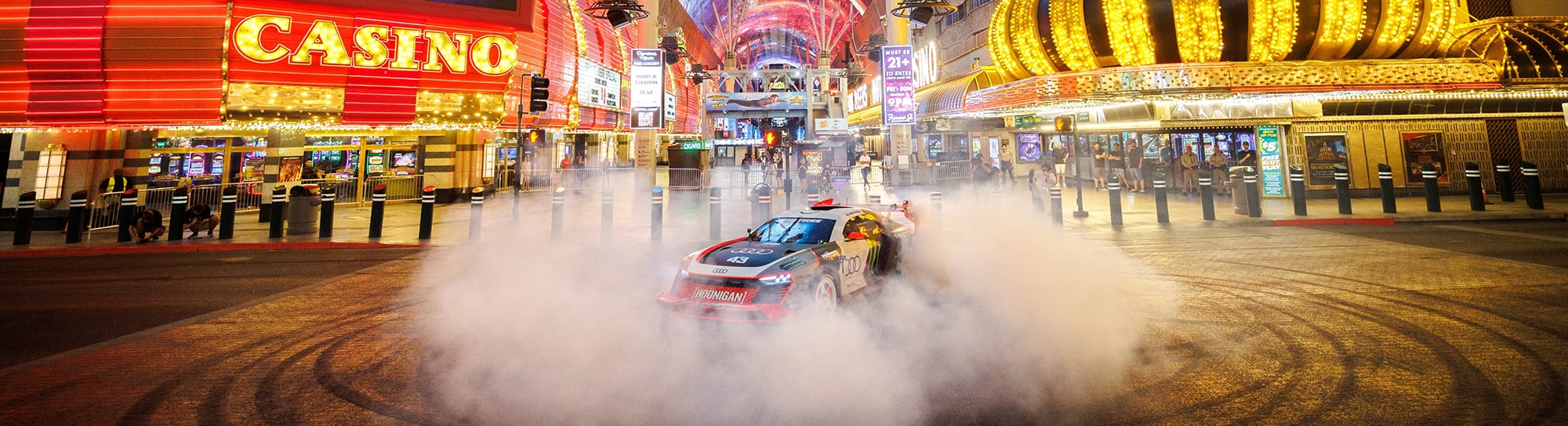 The neon glow, casino bulb flicker and radiating vibrance of Sin City after hours set an iconic scene for the first installment of Electrikhana. And the unprecedented access to multiple Casinos, the Las Vegas Strip and Fremont Experience make this one of the most technically ambitious films for the Hoonigan crew.