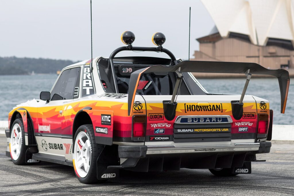 Designer Khyzyl Saleem (The Kyza) reshaped the BRAT’s classic lines into something wider and more aggressive while keeping it unmistakably Subaru. The livery mixes 1970s Subaru colors with modern Gymkhana flair, including kangaroos giving thumbs up, Pastrana plaid, and sponsor touches from KMC Wheels, Mercury Marine, Yokohama, Heat Wave, and Dixxon.