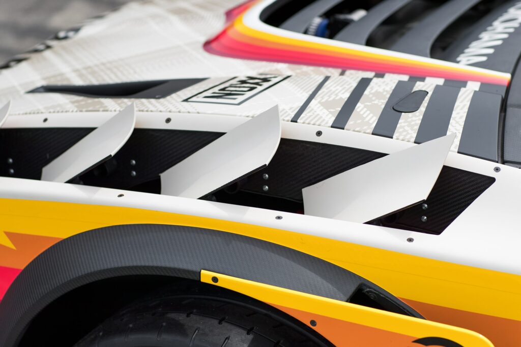 That is not an exaggeration. The Brataroo’s active aero system adjusts its balance while airborne. The front fender louvers can pivot forward or back to control the car’s attitude, and two interchangeable rear wings provide stability or agility depending on the stunt. The larger wing even expands as it deploys, increasing surface area for extra control.